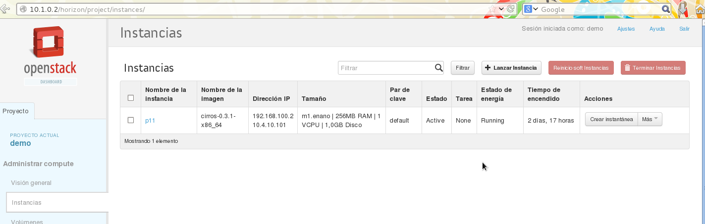 Durante la instalación se han creado dos usuarios: un usuario de prueba: demo con contraseña secret, este usuario es el propietario del proyecto demo, en el que se ha creado la instancia de prueba. También podemos acceder con el usuario admin, cuya contraseña está guardada en un fichero que luego comentaremos.