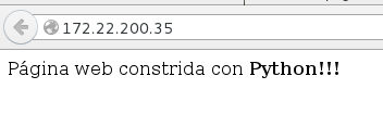 environ, del móduloos, que provee un diccionario de las peticiones HTTP estándar y otras variables de entorno, y la funciónstart_response, de WSGI, encargada de entregar la respuesta HTTP al usuario.# -*- coding: utf-8 -*- def application(environ, start_response): # Guardo la salida que devolveré como respuesta respuesta = "<p>Página web construida con <strong>Python!!!</strong></p>" # Se genera una respuesta al navegador start_response('200 OK', [('Content-Type', 'text/html; charset=utf-8')]) return respuesta