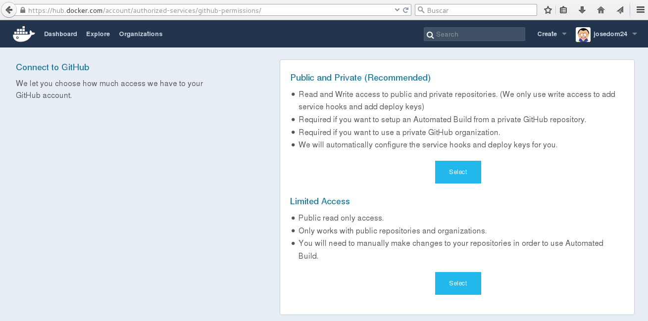 La primera vez que lo hacemos tenemos que conectar docker con github y permitir que docker hub pueda acceder a nuestro repositorio, elegimos que nos vamos a conectar a github y seleccionamos la primera opción (Public and Private) donde permitamos más opciones de trabajo, finalmente desde github autorizamos a la aplicación docker hub. Para conseguir todo esto tenemos que seguir los siguiente pasos: