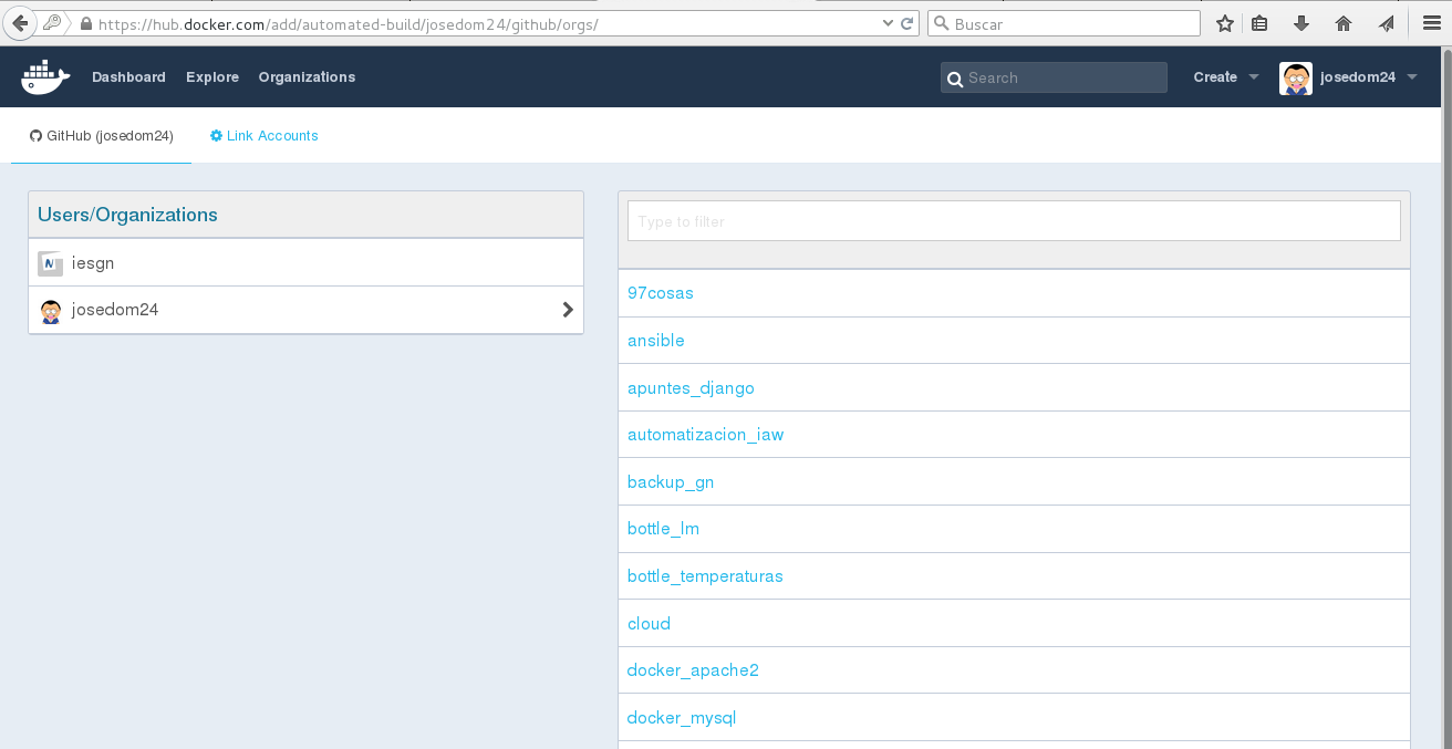 Una vez realizado esta configuración, ya podemos crear un “Automated Build”, elegimos un repositorio github: